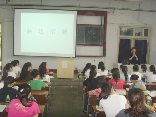 为进一步做好2009届毕业生就业工作,护理学院广泛收集用人信息,经与用人单位多方联系,邀请用人单位来校招聘毕业生。于5月20日和21日分别邀请了北京中国燕达国际健康城养护中心和泰山医学院附属医院来校为护理学院学生举办了专场招聘会。