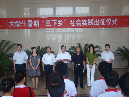 仪式在庄严的国歌声中开始,姜继玉和刘学景分别讲话,他们指出,我校“三下乡”社会实践活动有着优良的传统,取得过突出的成绩,学校已连续14年被评为“山东省大学生社会实践活动先进单位”,2007年我校大学生医疗卫生服务团还被授予“全国大学生社会实践活动百支优秀服务团队”;学校一直致力于发动同学参与社会实践活动,并将此项活动纳入到人才培养计划,通过活动,让同学们更好地了解社会、认识社会、服务社会,在与人民群众的接触中“受教育、长才干、强素质、做贡献”。学校领导还针对今年“三下乡”社会实践活动提出了几点意见:一是要精心组织,保证质量;二是要突出重点,讲求实效;三是要团结协作,树立形象;四是要遵守纪律,注意安全。