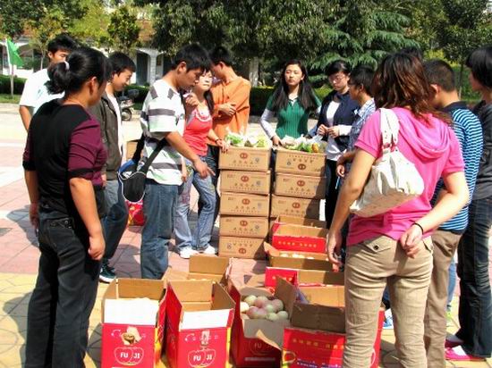 10月2日上午,秋高气爽,大学生活动中心前人头攒动,有的学生拎着月饼,有的学生抱着苹果,还有的在呼唤同学过来帮忙,在去二楼的楼梯上堆着小山似的装满月饼和苹果的箱子。
