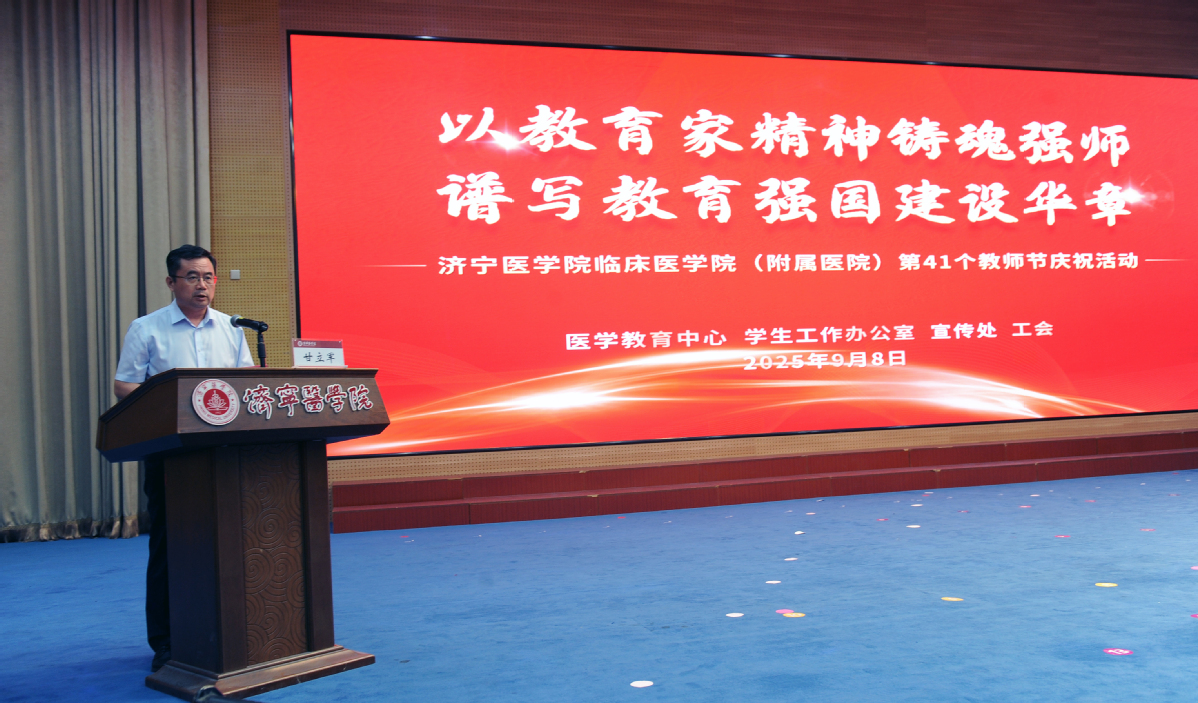 甘立军代表医院党委向全体教师致以节日的问候和崇高的敬意,他要求,要坚持以教育家精神为引领,全面落实立德树人根本任务,持续深化“院院合署”改革,推动医、教、研、管深度融合,加快构建“1+1+14+N”集群发展新格局。广大教师既是临床一线的中坚力量,也是医学教育的主力军,要努力成为学生为学、为事、为人的“大先生”,为教育强国和健康中国建设贡献智慧和力量。