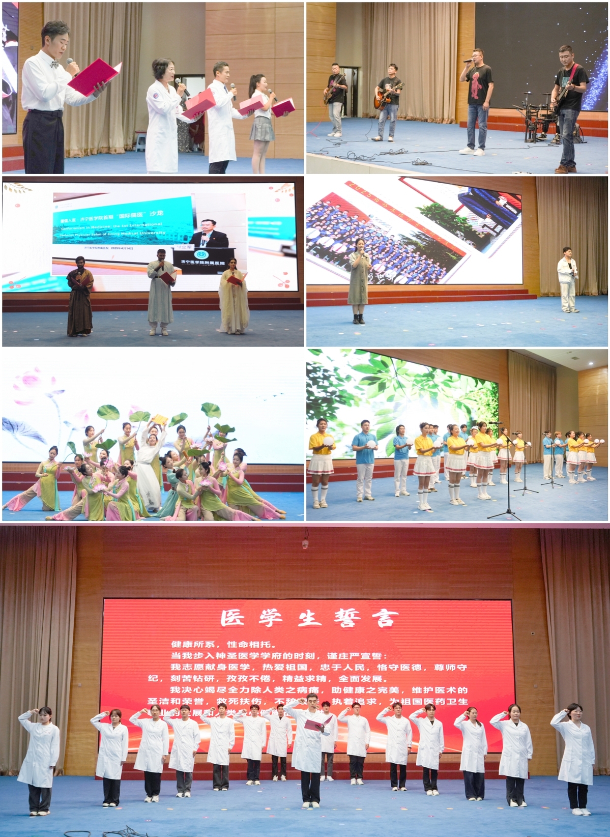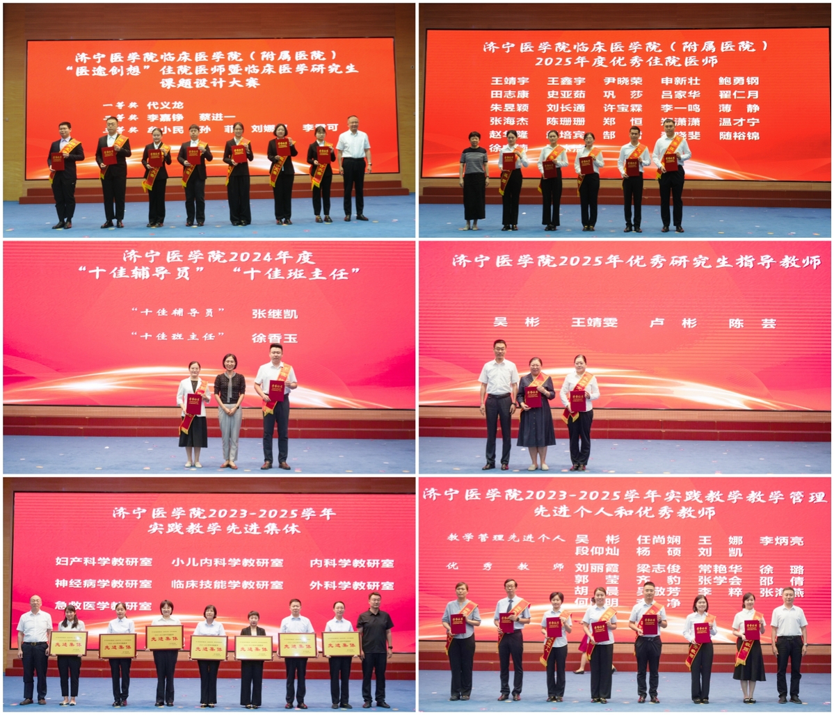 表彰大会通过颁奖典礼、文艺展演、集体宣誓等多种形式,全面展现了附属医院(临床医学院)师生积极向上、奋发有为的精神风貌。“师恩如歌、岁月情长”篇章中,学生为教学督导专家献上鲜花,表达崇高敬意;歌曲《最美的太阳》,诗朗诵《院院合署,师者担当》深情讴歌了临床教师的使命与担当。“匠心筑梦、薪火荣光”篇章中,举行了“仁术育英”教师教学发展分中心揭牌仪式,并对在临床教师教学竞赛、技能操作比赛、辅导员素质能力大赛、“医途创想”课题设计大赛中获奖的教师,以及优秀住院医师、十佳辅导员、十佳班主任、优秀研究生指导教师、实践教学先进个人等进行了集中表彰。歌曲《夜空中最亮的星》、诗朗诵《师说》《把光递给你》等节目精彩纷呈,充分展现师生风采与育人成果。“育见未来、共赴新程”篇章中,2025级住院医师庄严宣读的《中国医学生誓言》、舞蹈《清荷书韵》、小合唱《给我一双翅膀》《向光而行》等节目将现场气氛推向高潮。