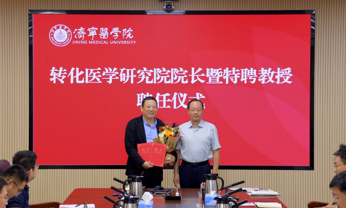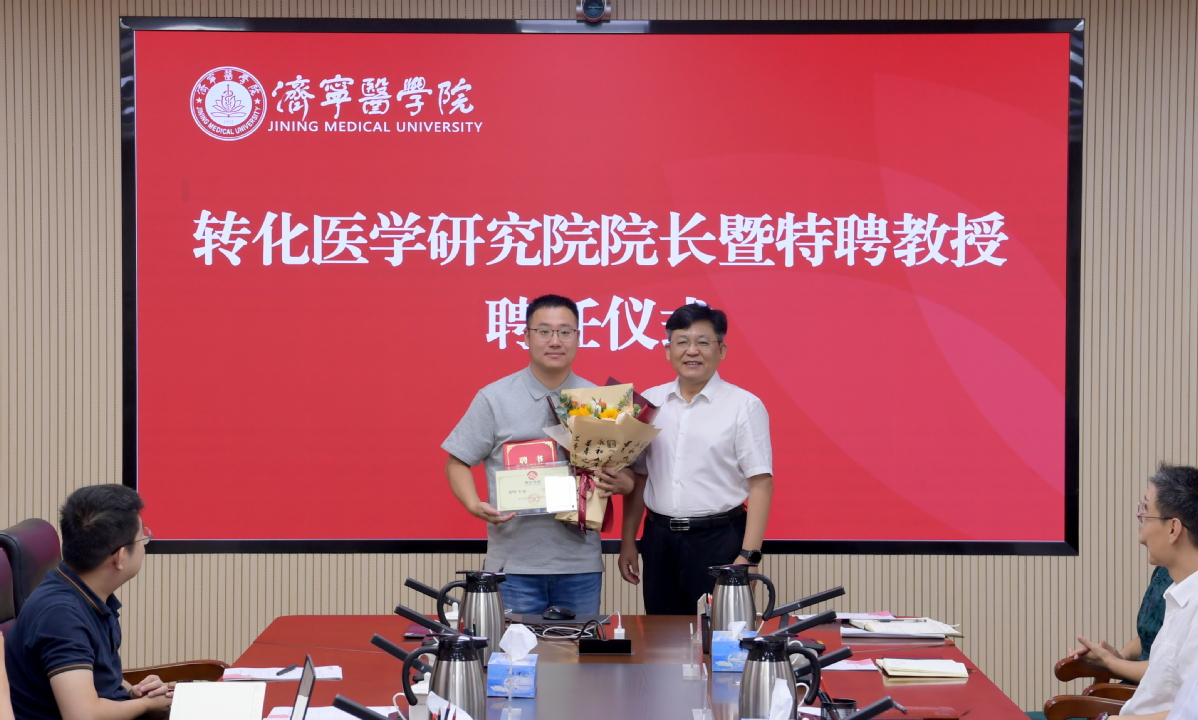 李栋为王金武颁发“济宁医学院转化医学研究院院长”和“济宁医学院特聘教授”聘书,刘传新为宋明智颁发“泰山学者青年专家”证书和“济宁医学院转化医学研究院副院长”聘书。