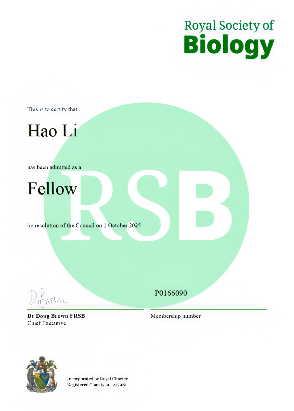 近日,我校公共卫生学院李灏教授入选2025年度英国皇家生物学会会士(Fellow of the Royal Society of Biology,FRSB)。