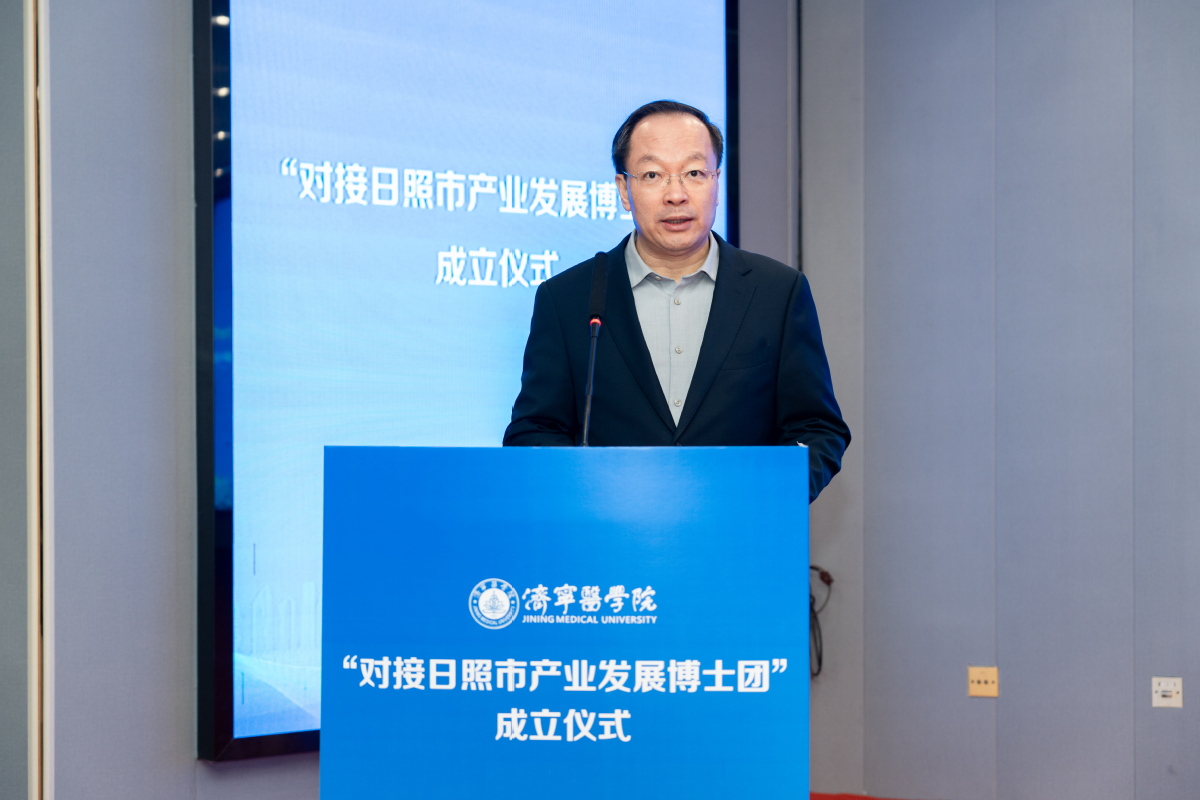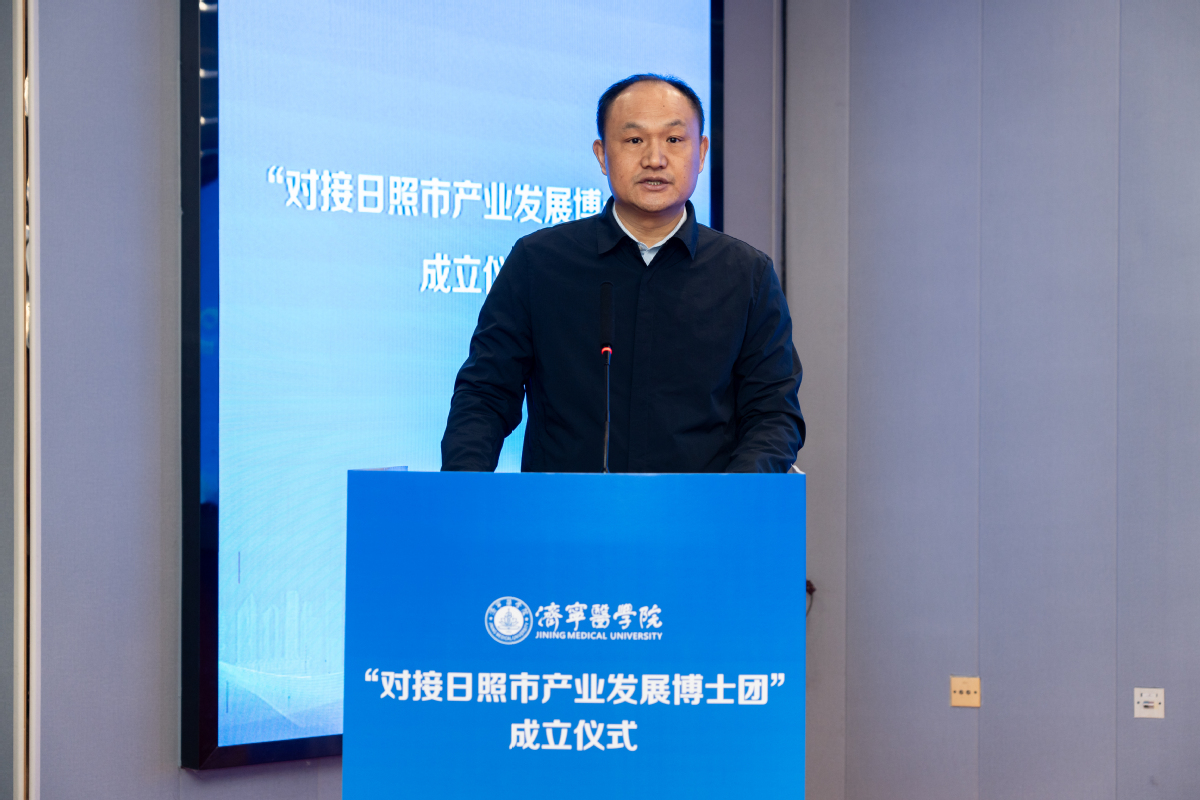 李栋从学校的发展历史和办学格局、人才培养和办学规模、科技创新和社会服务等方面介绍了学校基本情况。他表示,“对接日照产业发展博士团”的成立,既是学校主动融入山东省重大战略、服务绿色低碳高质量发展先行区建设的创新举措,也是我们系统性深化校地合作、推动高质量全面对接的重要实践,标志着校地合作迈入了优势互补、融合发展、共创共赢的新阶段。他希望博士团全体成员,以服务社会、造福地方为使命,精准对接产业需求,深入产业园区、地方企业、医疗机构一线,聚焦产业前沿与关键核心技术难题,开展前瞻性、突破性研究,发扬团结协作、求真务实的作风,推动产教融合、科创协同、人才共育走深走实,努力在生物医药、健康管理、智慧医疗等领域产出一批实用、管用的创新成果,真正为日照产业发展贡献济医智慧和力量。未来,学校将持续深化城市+大学”共同体建设,充分发挥教育科技人才资源优势,与日照协同开展科研创新,打造校地融合、协同发展示范样板,为“健康山东”和“教育强省”建设贡献力量。